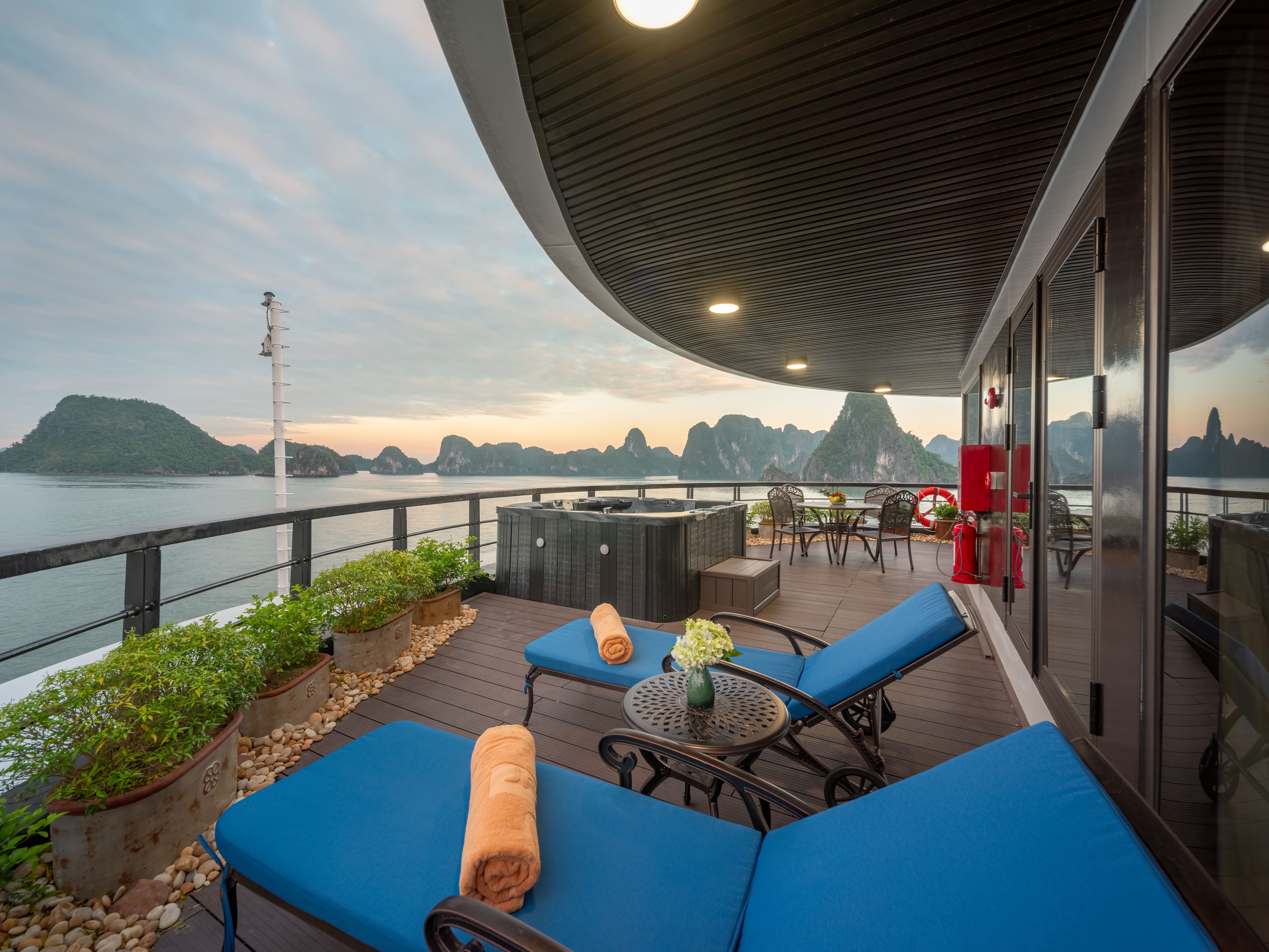 Từ khu vực ban công riêng rộng rãi, Quý khách có thể vừa thư giãn bằng việc sử dụng bể sục Jacuzzi ngoài trời, vừa phóng tầm mắt bắt trọn khung cảnh biển trời bao la, hùng vĩ của Hạ Long.