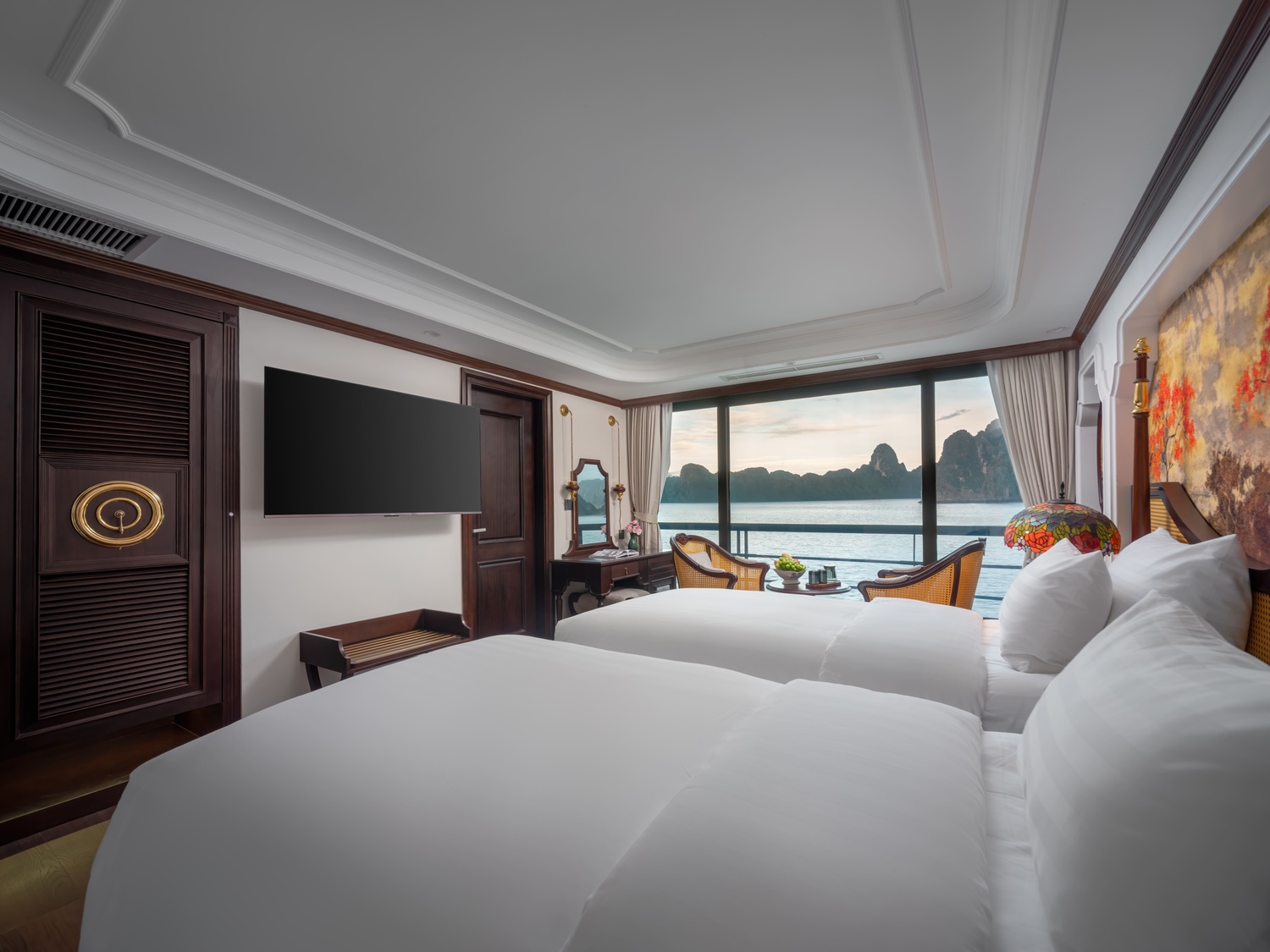 A private balcony and an outdoor Jacuzzi elevate the experience, allowing guests to unwind while taking in uninterrupted views of the emerald waters and limestone cliffs of Halong Bay. The interior showcases a graceful white palette paired with classic dark-wood accents, creating a harmonious blend of nostalgia, sophistication, and modern luxury.