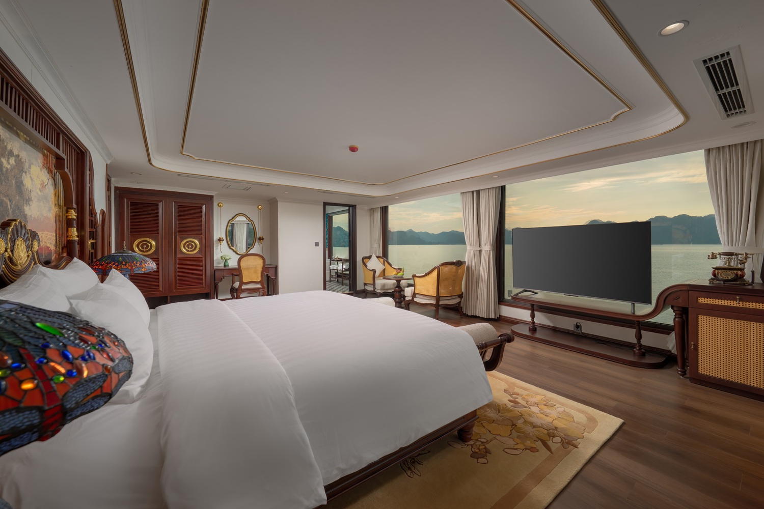 A private balcony and an outdoor Jacuzzi elevate the experience, allowing guests to unwind while taking in uninterrupted views of the emerald waters and limestone cliffs of Halong Bay. The interior showcases a graceful white palette paired with classic dark-wood accents, creating a harmonious blend of nostalgia, sophistication, and modern luxury.
