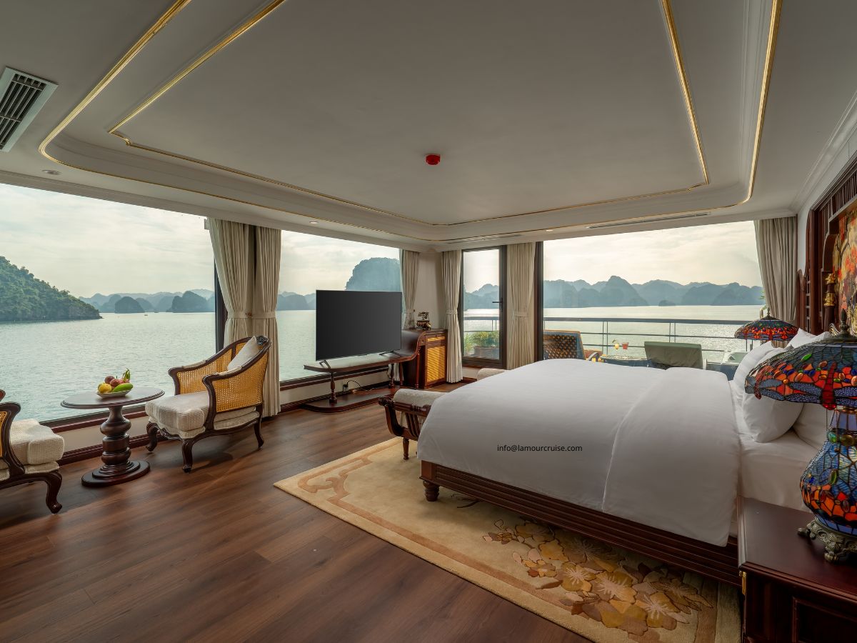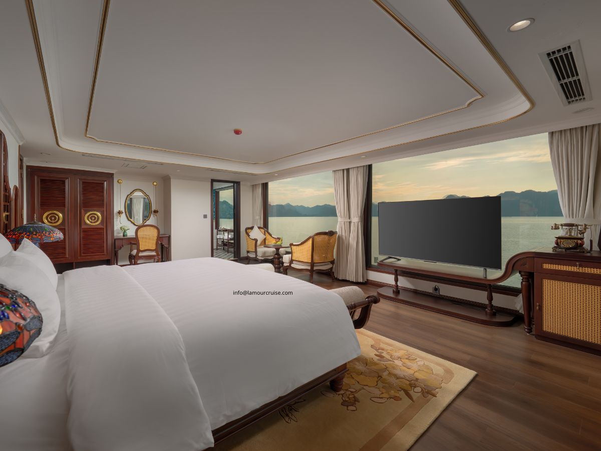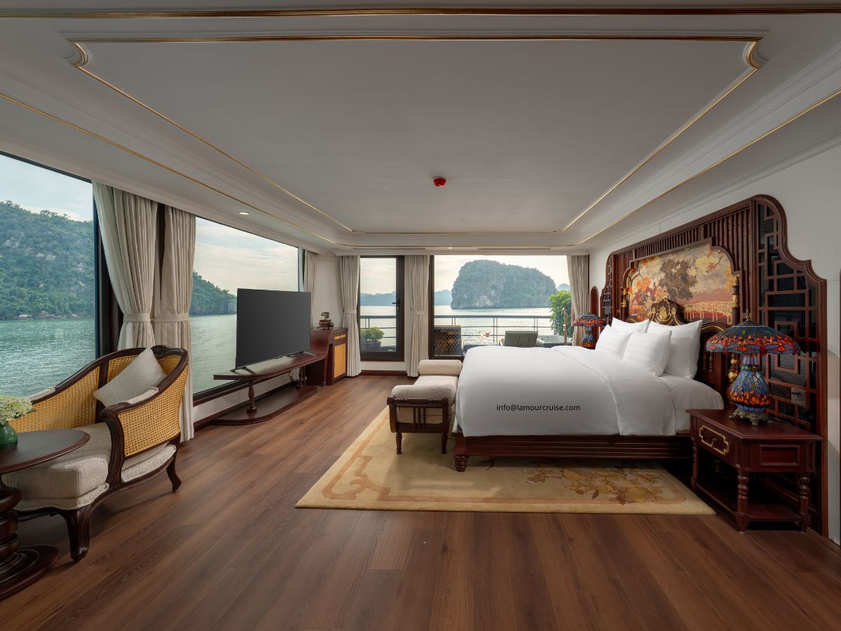 Located on the first deck of Halong Lamour Cruise, the Century Suite welcomes guests with a refined Indochine-inspired design that blends comfort, warmth, and understated luxury. The room features expansive windows that open up to the breathtaking beauty of Halong Bay, allowing travelers to fully embrace serene sunrise views and golden sunsets right from their private space.