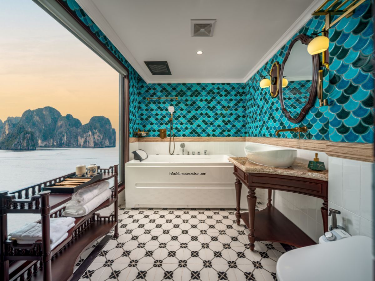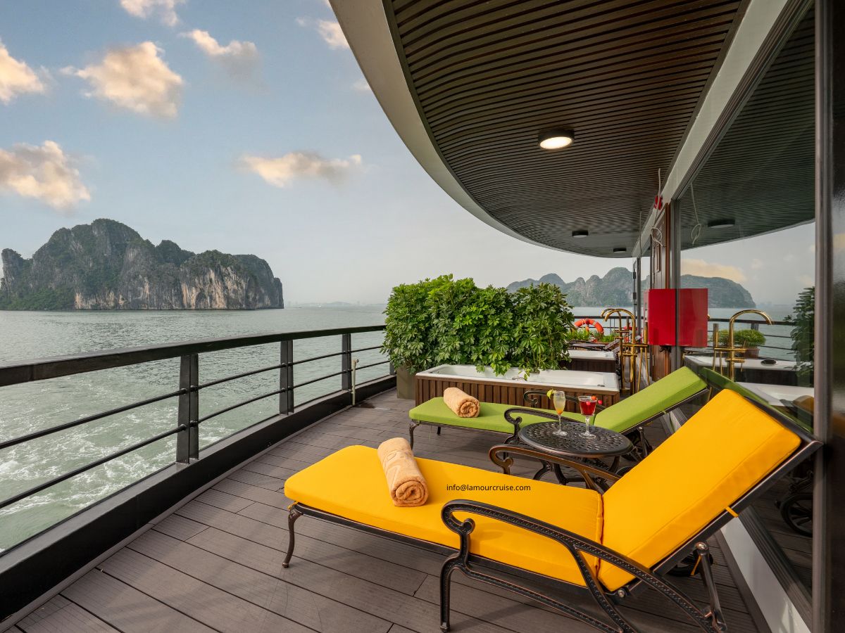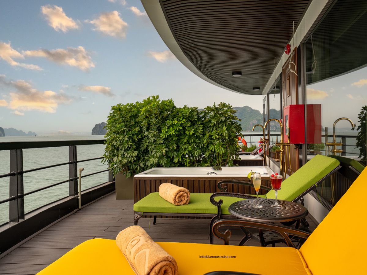 Positioned at the very front of the second deck on Halong Lamour Cruise, the Majestic Suite is designed to offer what many guests call a true “million dollar view.” From its private balcony, travelers can unwind in the outdoor Jacuzzi while gazing across the endless expanse of Halong Bay, where the ocean and sky meet in a breathtaking panorama.