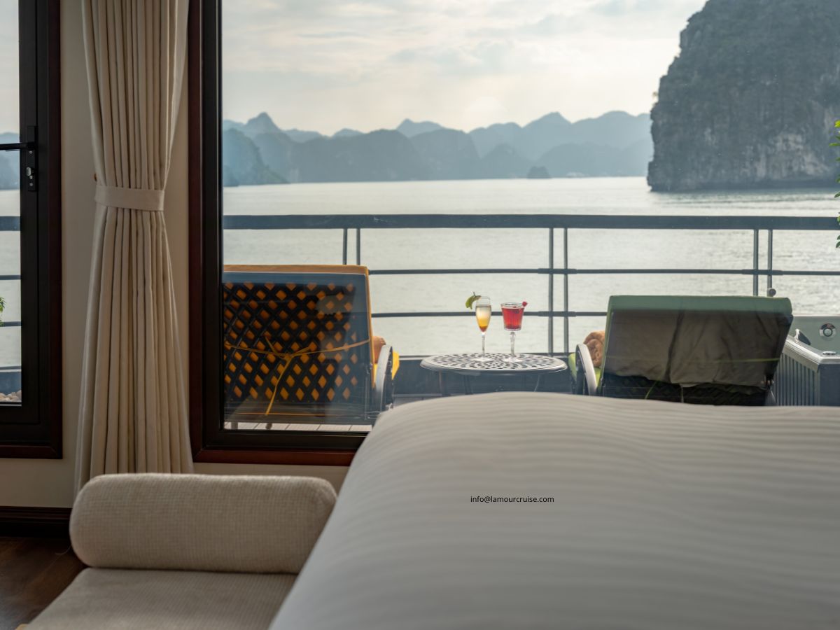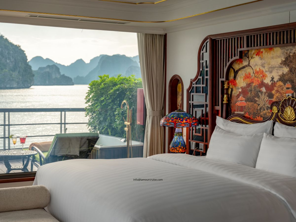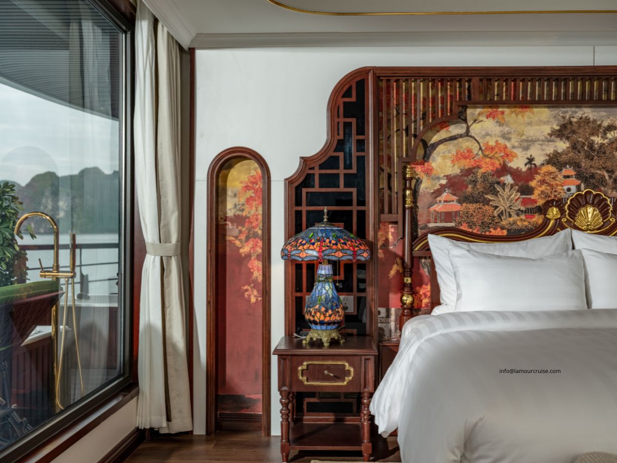 Located on the second and third decks of Halong Lamour Cruise, the Oriental Suite is meticulously crafted with refined Indochine touches, offering an atmosphere of elegance, tranquility, and absolute privacy. Every detail is thoughtfully designed to create a serene retreat for travelers seeking a more elevated Halong travel experience.
