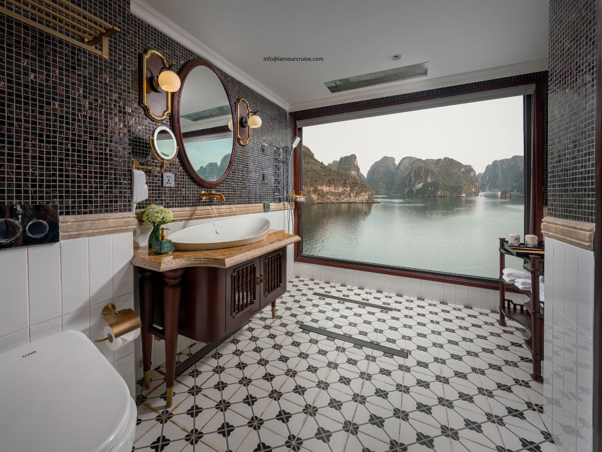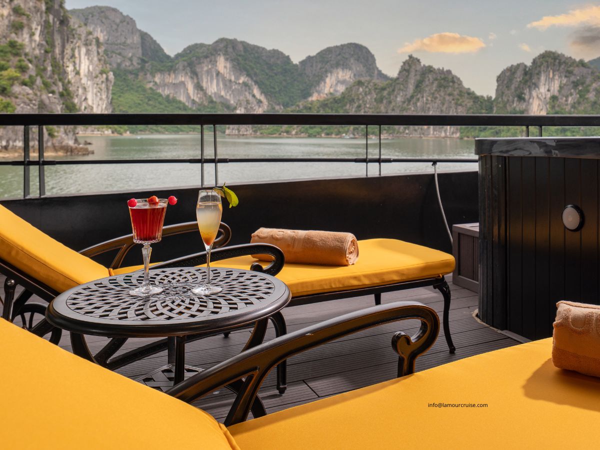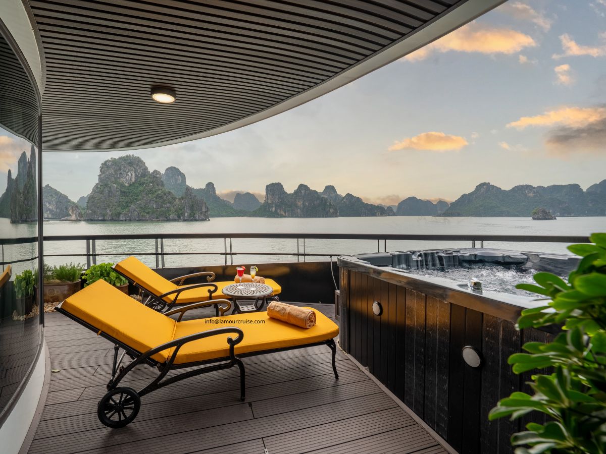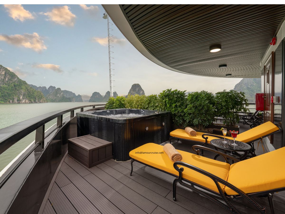 A private balcony and an outdoor Jacuzzi elevate the experience, allowing guests to unwind while taking in uninterrupted views of the emerald waters and limestone cliffs of Halong Bay. The interior showcases a graceful white palette paired with classic dark-wood accents, creating a harmonious blend of nostalgia, sophistication, and modern luxury.