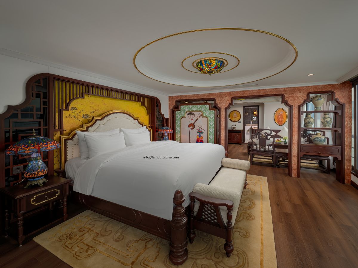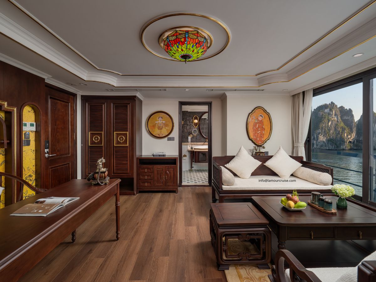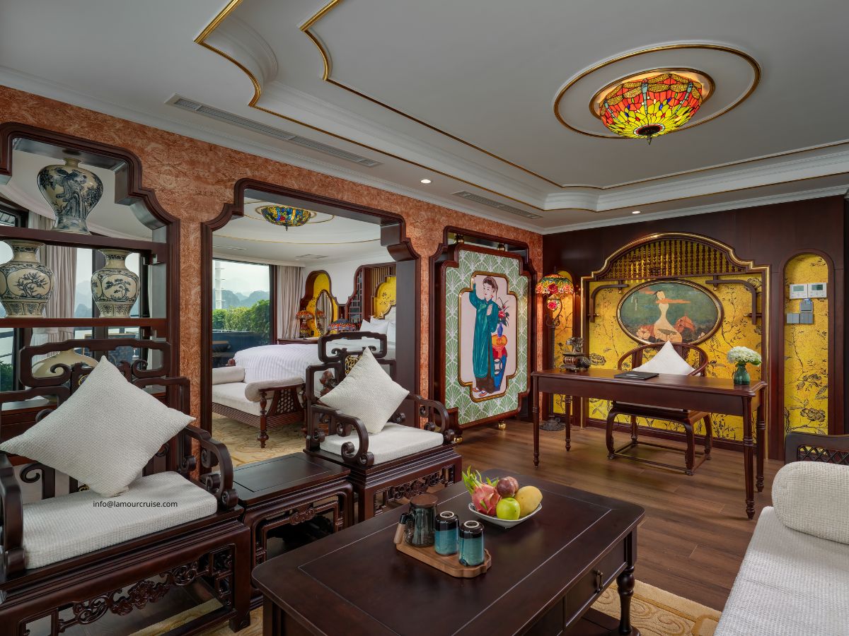 The Imperial Suite is designed to deliver an exceptional level of comfort, combining generous space, premium amenities, and a refined Indochine aesthetic. Located at the rear of the second and third decks of Halong Lamour Cruise, this exclusive suite features four individually designed premium rooms, each offering its own unique charm.