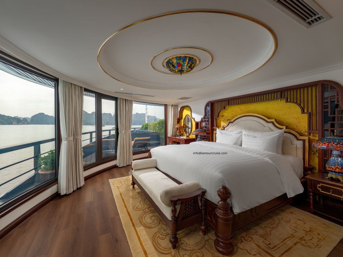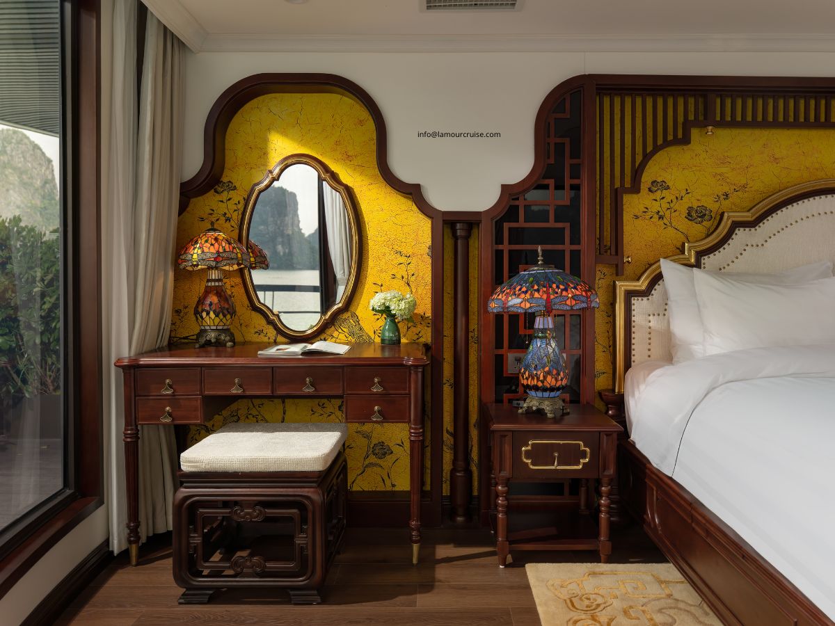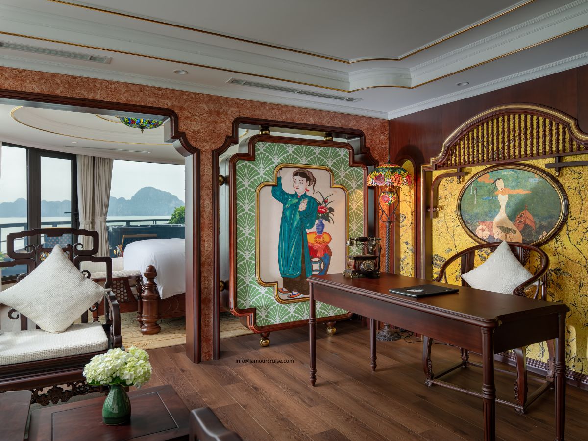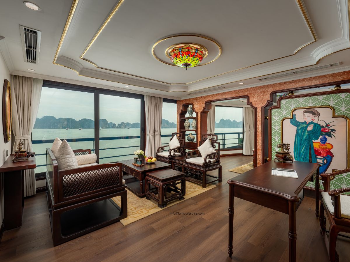 The Imperial Suite is designed to deliver an exceptional level of comfort, combining generous space, premium amenities, and a refined Indochine aesthetic. Located at the rear of the second and third decks of Halong Lamour Cruise, this exclusive suite features four individually designed premium rooms, each offering its own unique charm.